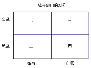 如图:按照组织或者部门目的的公益和私益以及组织活动方式的强制和自愿为两个维度,我们把社会上的各种组织或部门分为四类部门: